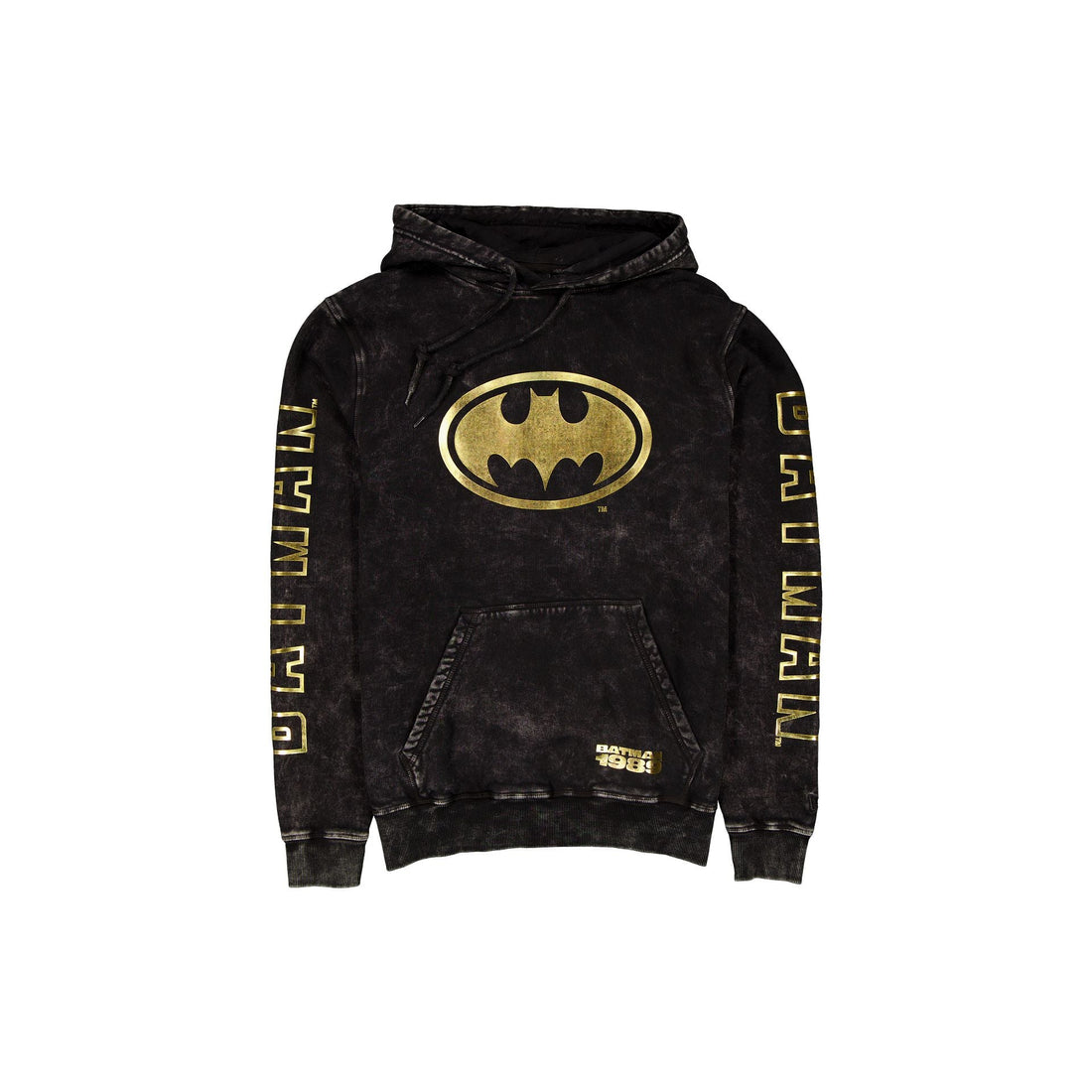 The Batman Acid Washed Hoodie features a gold screen-printed Batman logo at the chest with...