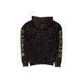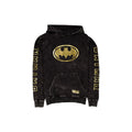 The Batman Acid Washed Hoodie features a gold screen-printed Batman logo at the chest with matching wordmarks at the sleeve and a Batman 1989 wordmark at the kangaroo pocket.