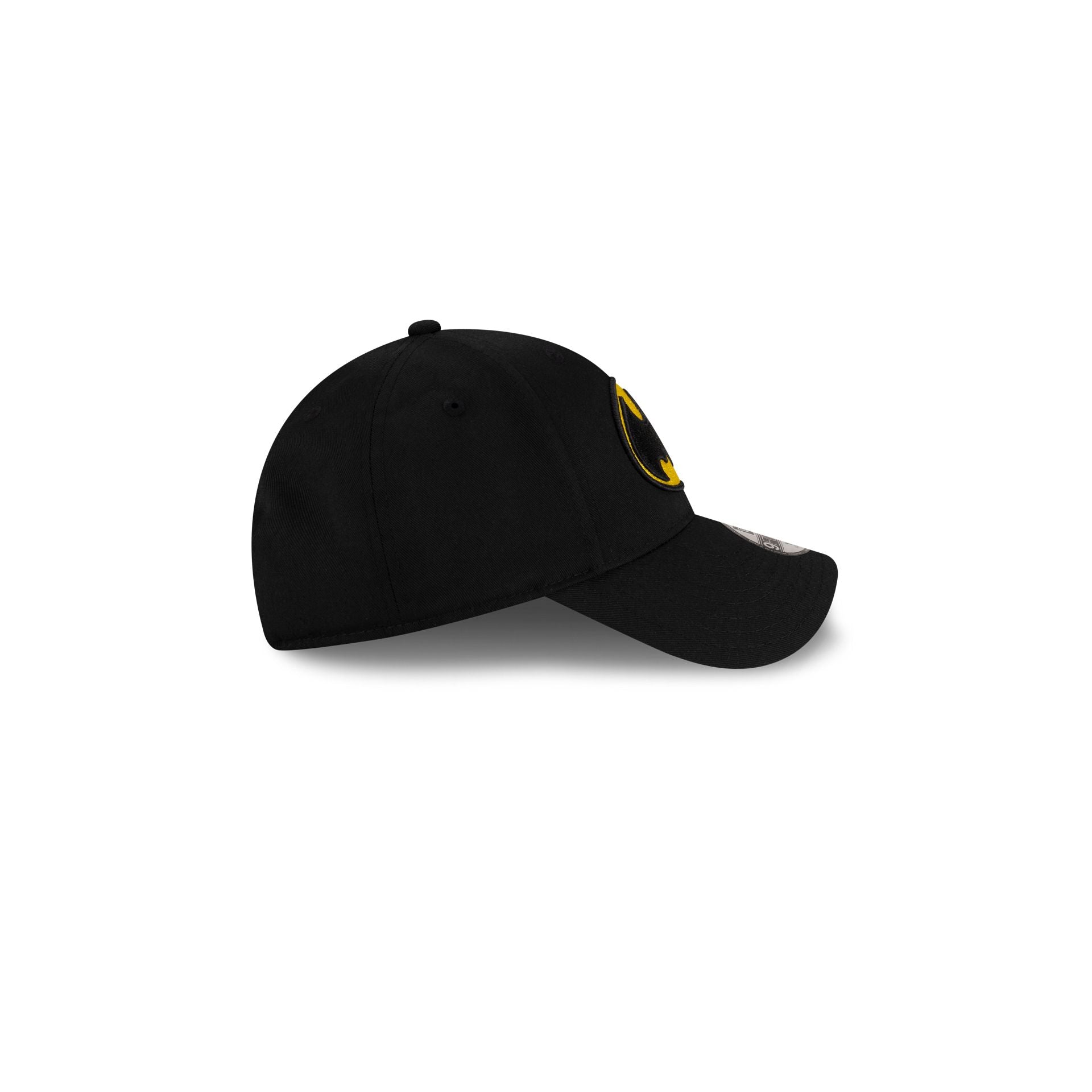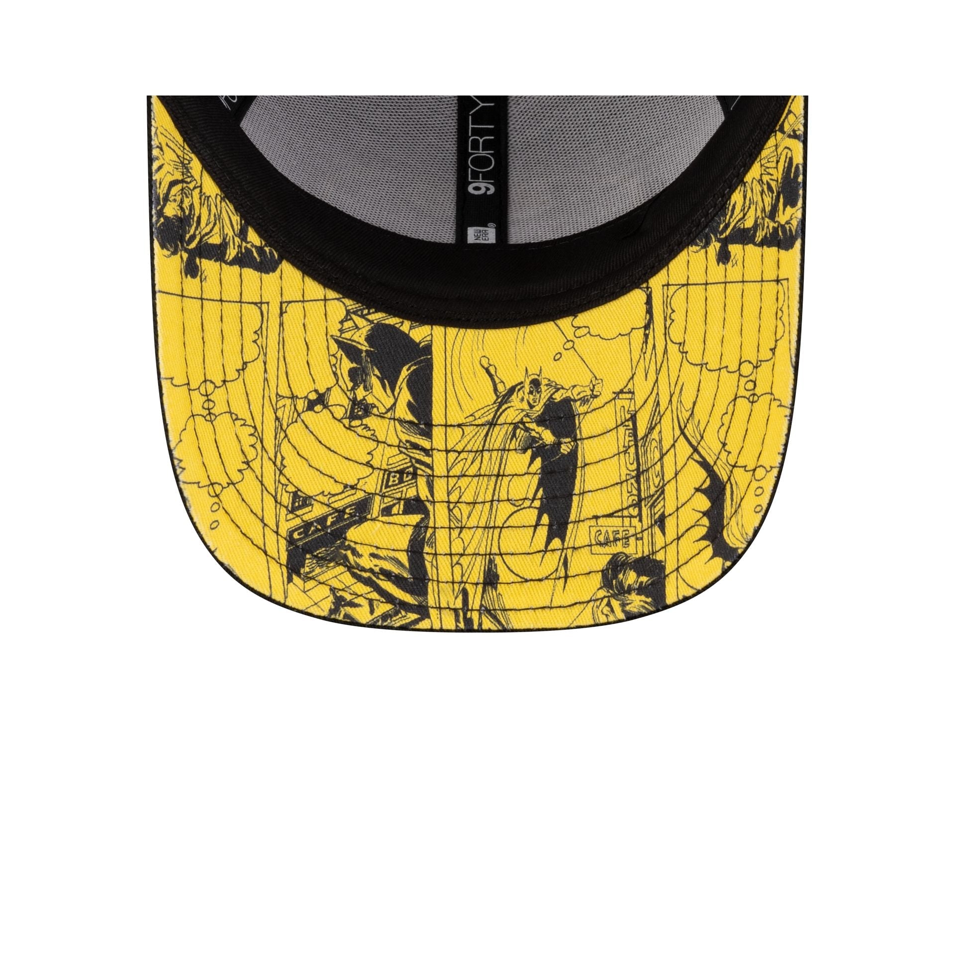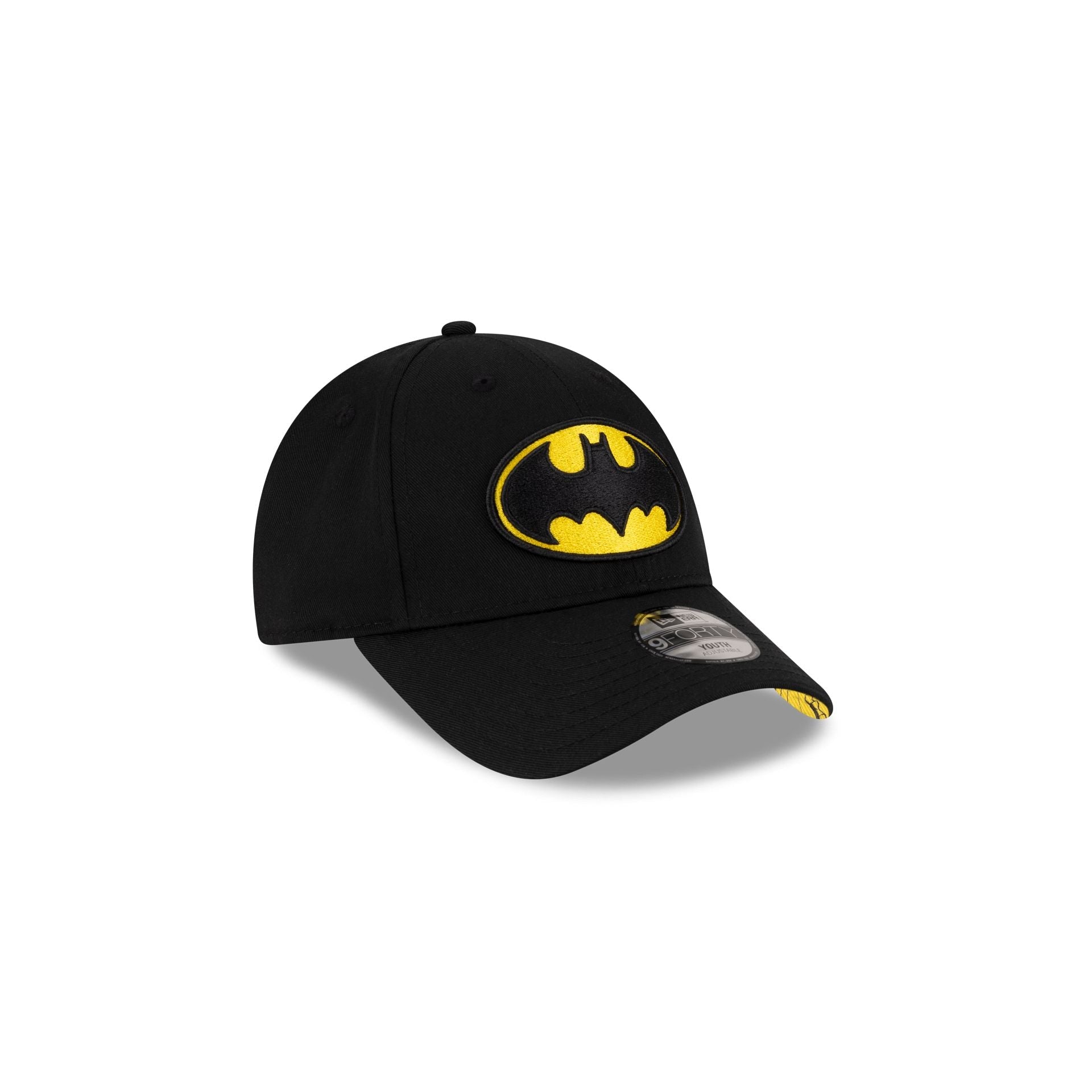 The Batman Black Kids 9FORTY Adjustable Cap features an embroidered Cap features an embroidered Batman logo at the front panels with a yellow comic book allover print undervisor and an adjustable D-Ring closure at the rear.